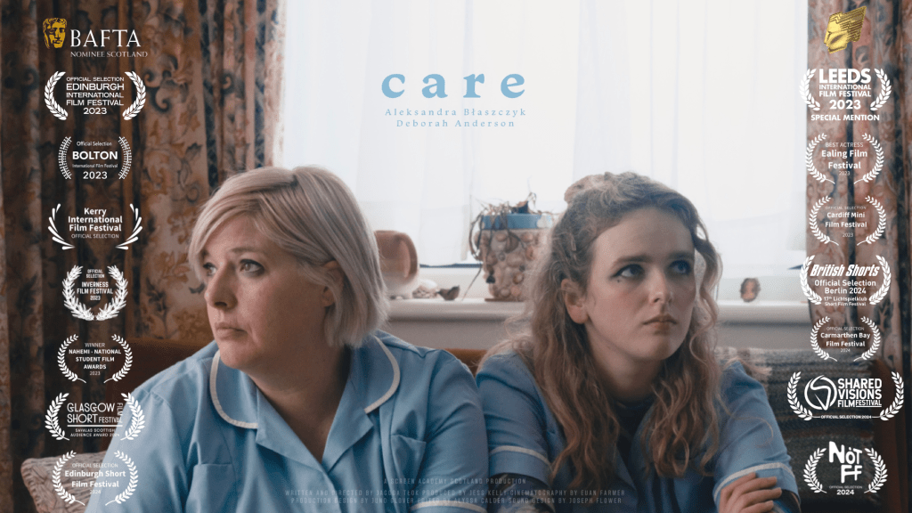 ‘Care’ is an undergraduate graduation film from Screen Academy Scotland and was shot in March 2023 across 6 days and was made for only £4000 (funds raised kindly through crowdfunding donations). The filmmakers also received words of encouragement from Unison – the union representative of care workers in the UK. A full video of our conversation with care workers can be found on the films and respective filmmakers’ social media pages.